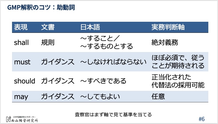 これには条件があります。みなさんがGMPを英語で読む場合です。多くの場合、日本のGMPもPIC/S GMPの流れを汲んでいるため、実務上の判断は原本や参考文献の英語を読む必要があります。そのため、「GMPの解釈→英文解釈→日本語訳→GMPの解釈のコツ→助動詞の訳と実務判断軸」という思考回路で、「助動詞!」と答えます。